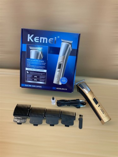 The Kemei KM-519 is a rechargeable hair trimmer and clipper designed for both home and professional use. It features stainless steel blades and adjustable combs for precise cutting lengths. The trimmer operates cordlessly after charging and offers around 50 minutes of use per charge.