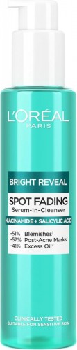 L'Oréal Paris Bright Reveal Spot Fading Serum-In-Cleanser (150ml) A gentle gel-to-foam cleanser that combines serum benefits to fade dark spots, correct hyperpigmentation, and reduce blemishes. Enriched with niacinamide and salicylic acid, it exfoliates, brightens skin, unclogs pores, and is suitable for all skin types, including sensitive skin.
