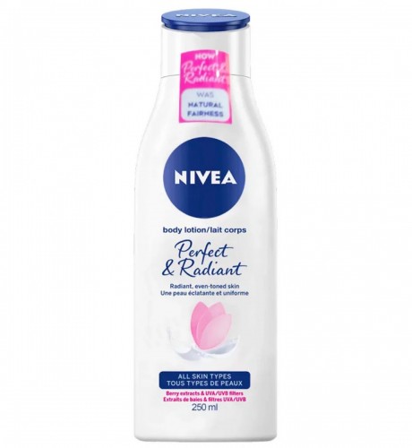 Nivea Perfect & Radiant Body Lotion (250ml) is a daily moisturizer designed to enhance the skin's natural radiance and even out skin tone. It combines moisturizing ingredients with brightening agents and UV filters to achieve a more even and radiant complexion.